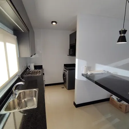 Los electrodomésticos de la cocina incluyen horno de microondas, hervidor eléctrico y nevera en una cocina completa.